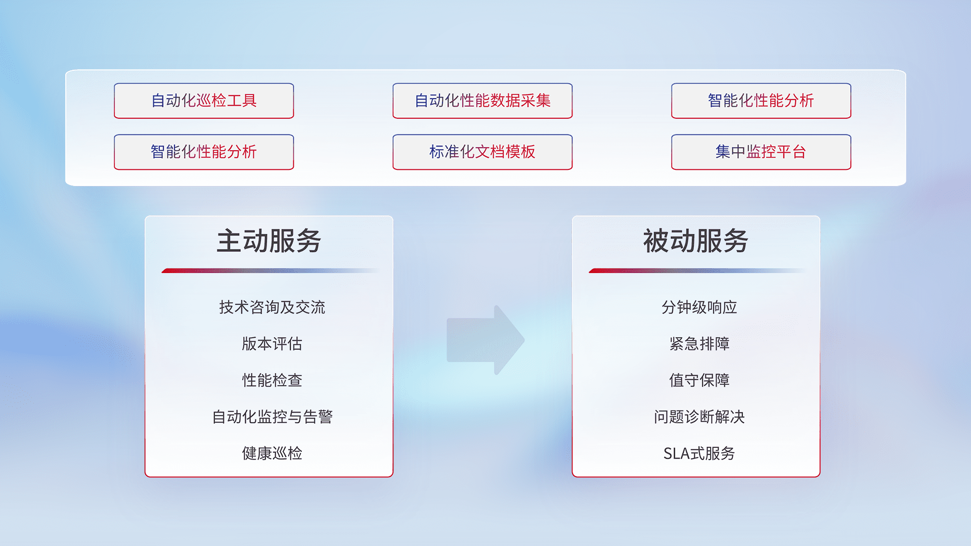 智能化工具和标准化文档,,,,保障服务质量,,提供主动服务(包含技术咨询、、版本评估、、性能检查、、、自动化监控与告警、、、健康巡检)和被动服务包含(分钟级响应、、紧急排障、、、、值守保障、、、问题诊断解决、、、SLA服务)。。